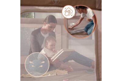 Το διαπνέον πλέγμα εξασφαλίζει σωστή κυκλοφορία αέρα και δεν περιορίζει την ορατότητα του μωρού, το οποίο μπορεί να σας βλέπει συνεχώς. Επιπλέον, το ύφασμα είναι εύκολο στη συντήρηση – αρκεί ένα πέρασμα με νωπό πανί για να παραμείνει καθαρό.